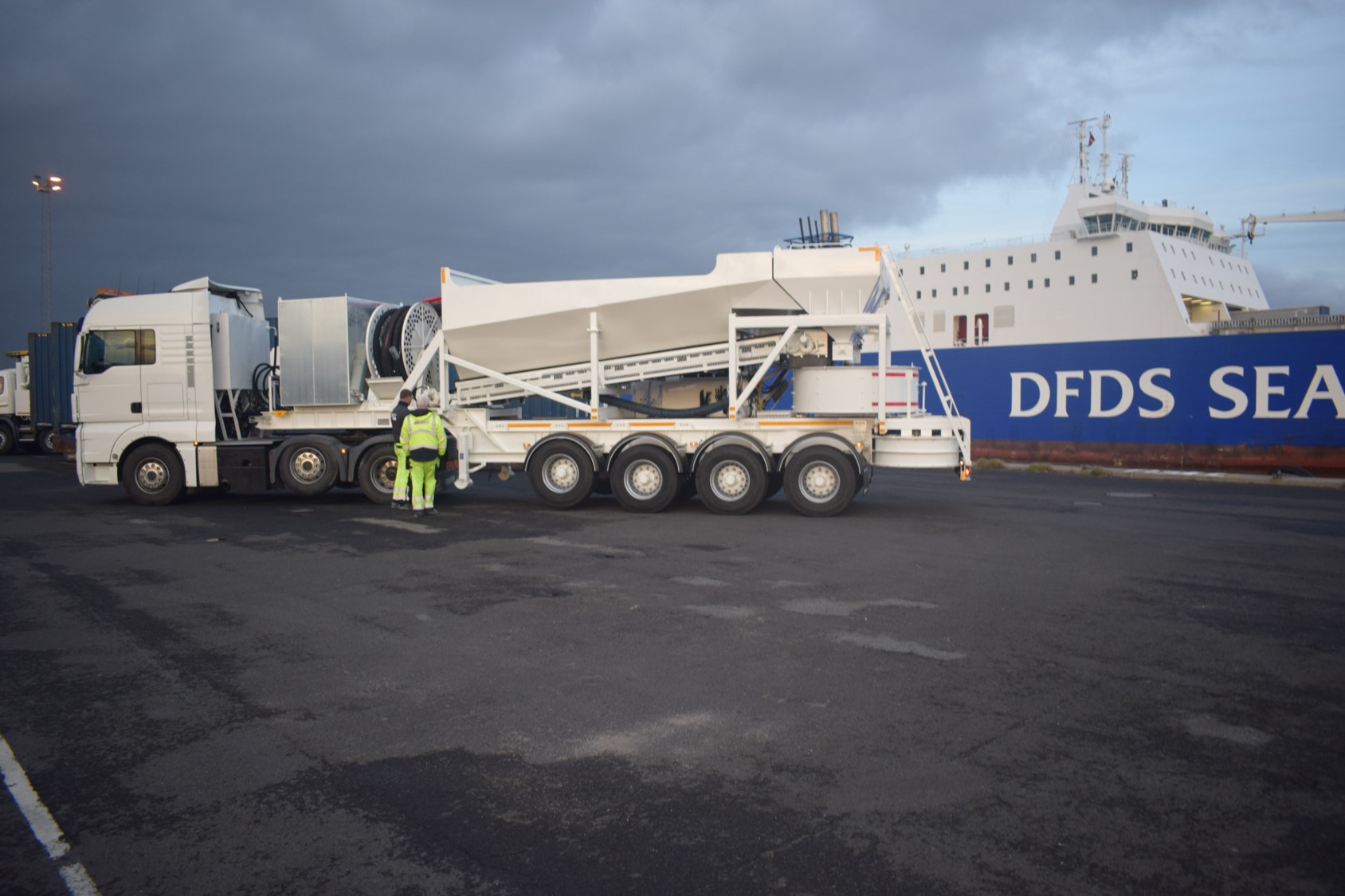 Det er efterhånden et år siden vi indledte forhandlingerne med IHS Pumps i England omkring udviklingen af en ny mobil betonmixer specielt til det danske marked og forleden landede den første af en serie på i alt 6 enheder i Esbjerg.