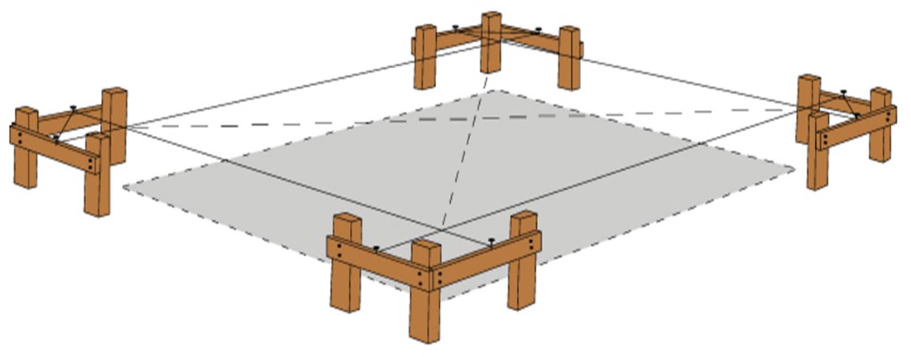 På lægterne sømmes 2 brædder (2.5×10 cm) i samme vandrette plan som for eksempel det plan, der svarer til oversiden af det kommende fundament. Dette plan kan bedst findes med et nivellerinstrument eller med et vaterpas og en lang lige trælægte og et passende antal støttepunkter undervejs mellem hjørnepunkterne.