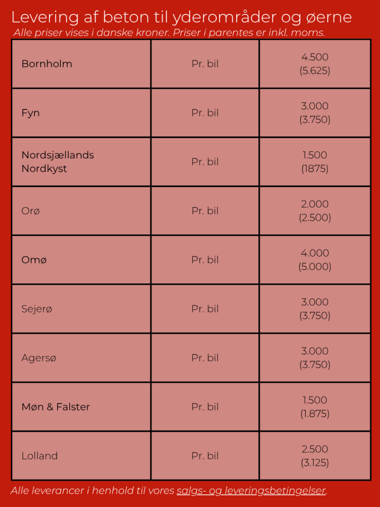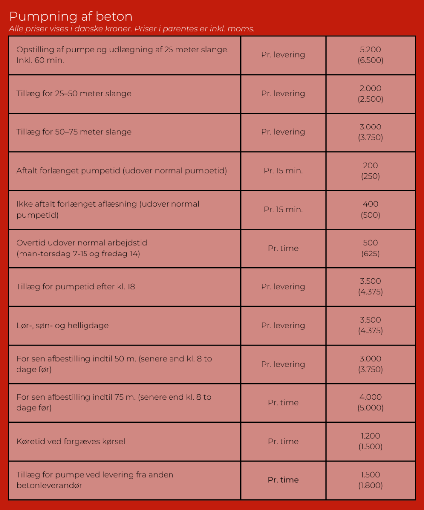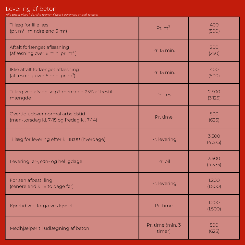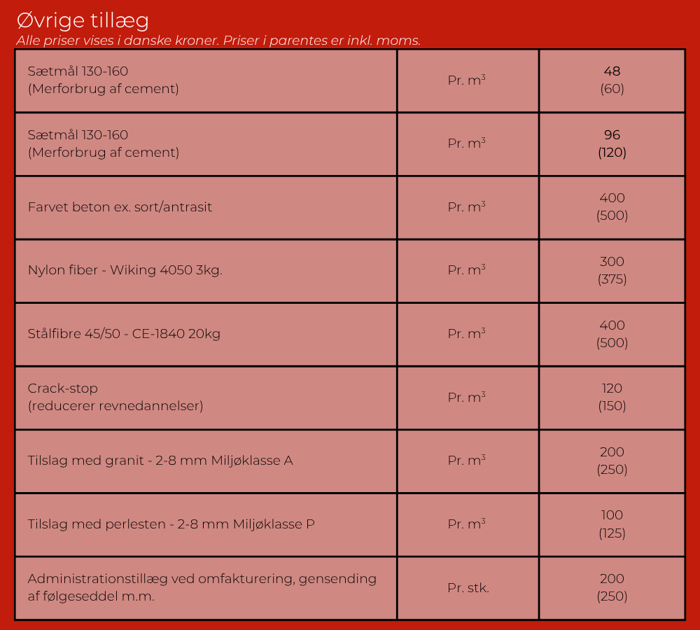 Bemærk: Vi har ikke fakturatillæg, dieseltillæg, CO2-tillæg, vintertillæg, tillæg for returbeton, tillæg for